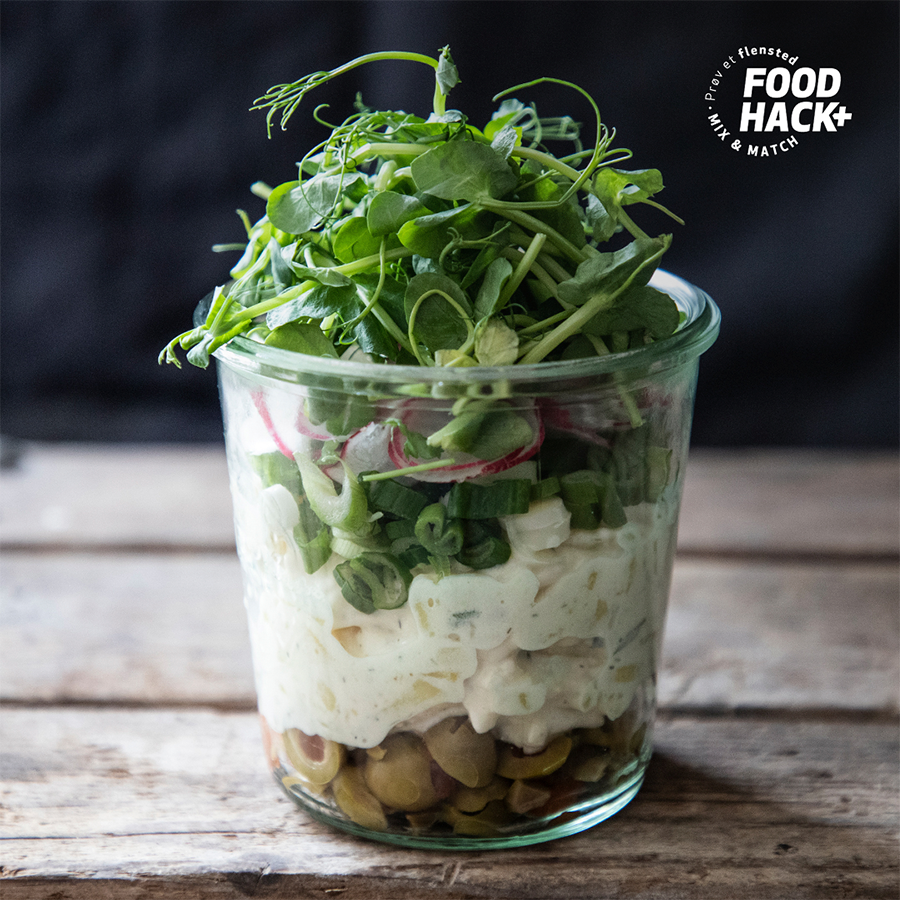 Cremet kartoffelsalat med løg, dild og purløg.